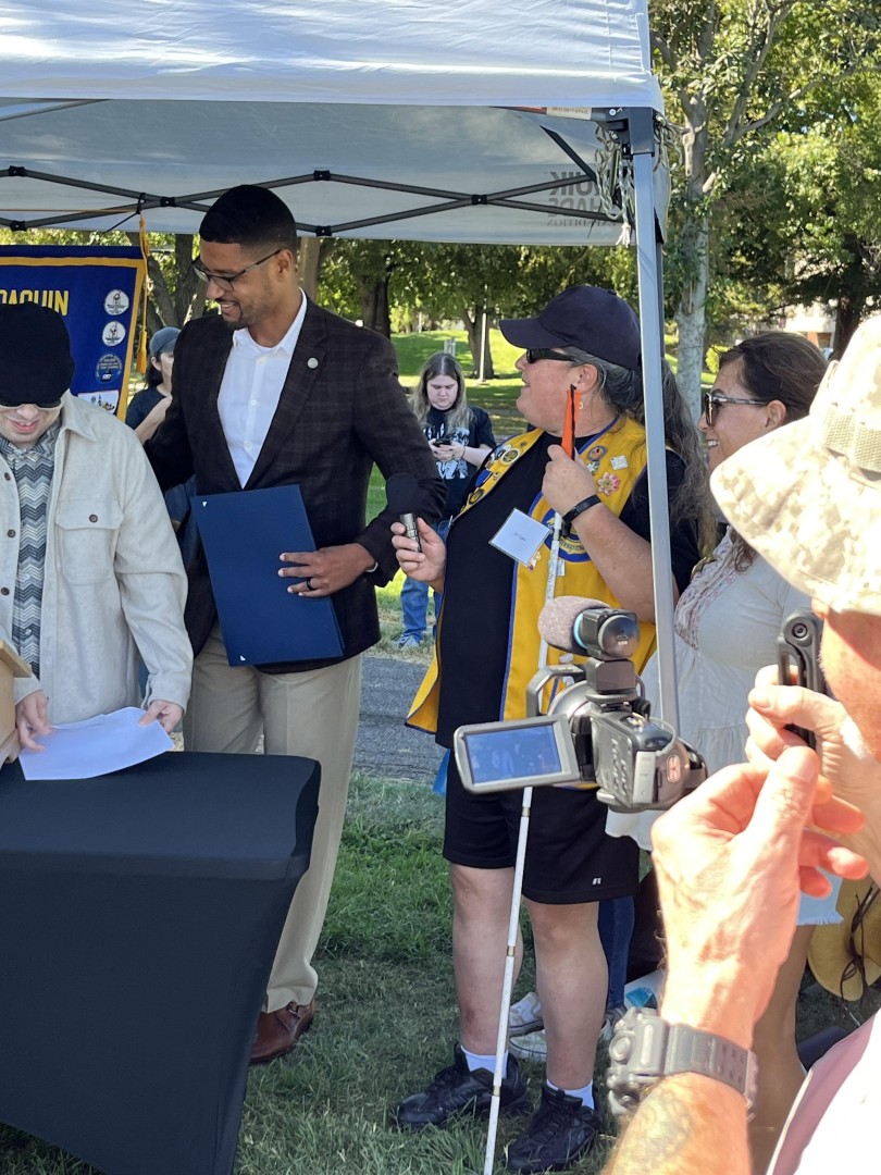 Access San Joaquin will have an info table, the NFB will be writing names in Braille and the Lions Clubs will be hosting blindness awareness challenges and collecting unwanted eyeglasses, pull tabs and new or gently used sneakers to recycle and help others in need. Volunteers will be teaching participants techniques to guide and interact with a blind person and allowing people to take a supervised “White Cane Wander” under blindfold to see what it’s like to navigate using a white cane and your other senses!