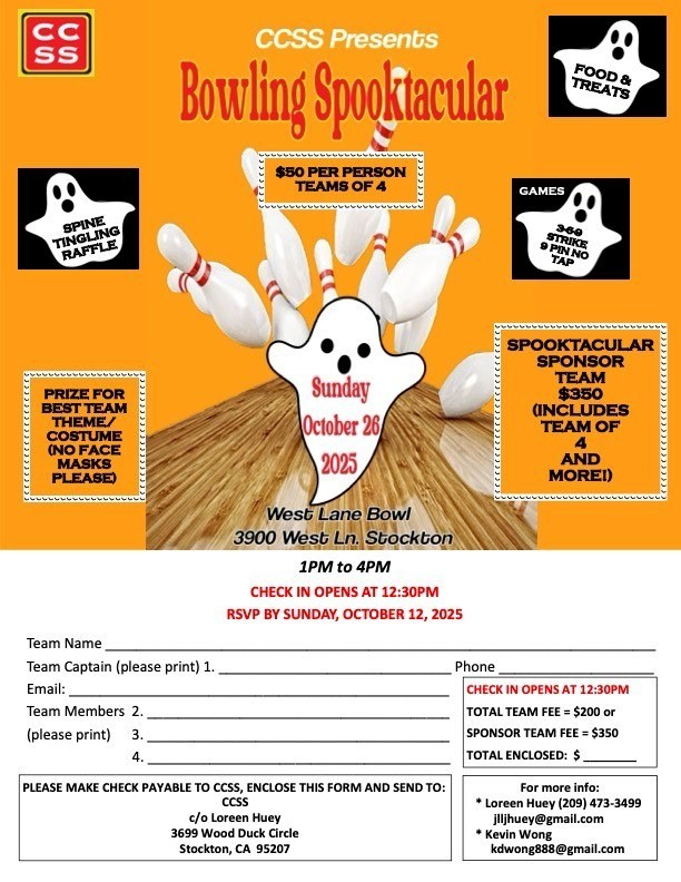 The Chinese Cultural Society of Stockton Bowling Spooktacular is just around the corner. Sunday Oct. 26th. We invite you to Gather up a team. It will be surely a Ghoulish of a time for family, friends & Specially Kids!