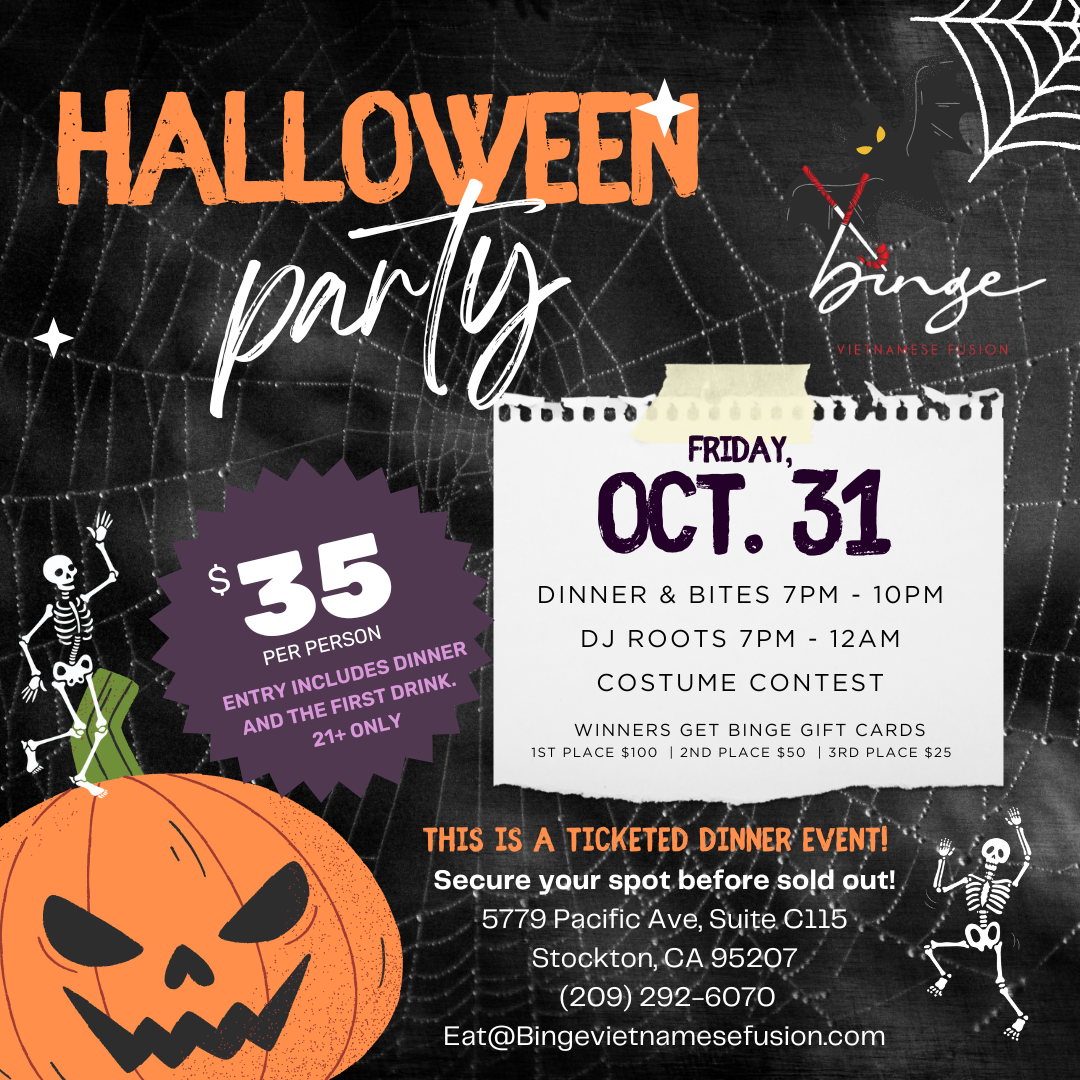 Celebrate Halloween with Binge Vietnamese Fusion! Your $35 ticket includes dinner (served 7–10 PM), your first drink, and a night full of fun with a live DJ spinning house music until midnight. Choose from Combo Fried Rice or Garlic Noodles with Shrimp, enjoy bar bites after 10 PM, and compete in our costume contest for a chance to win Binge gift cards ($100, $50, $25).