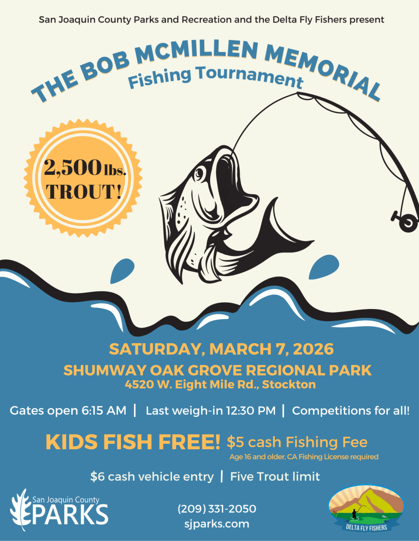 San Joaquin County Parks and Recreation and the Delta Fly Fishers will present the Annual Bob McMillen Memorial Fishing Tournament on Saturday March 7, 2026 at Oak Grove Regional Park in Stockton. Approximately 2,000 lbs. of Rainbow Trout (including 600 lbs. of trophy-size fish) will be stocked in Oak Grove’s 10-acre lake prior to the event. Named after the late S.J. County parks employee and avid fisherman Bob McMillen, the tournament will be open to all ages and feature three competitions: Youth (ages 10 and under), Teen (ages 11 - 17) and Adult (ages 18 and over). Each competition will measure the individual heaviest weight of one (1) trout caught by the participating contestant. Prizes will be awarded in each of the categories following the tournament. Food will be available for purchase.