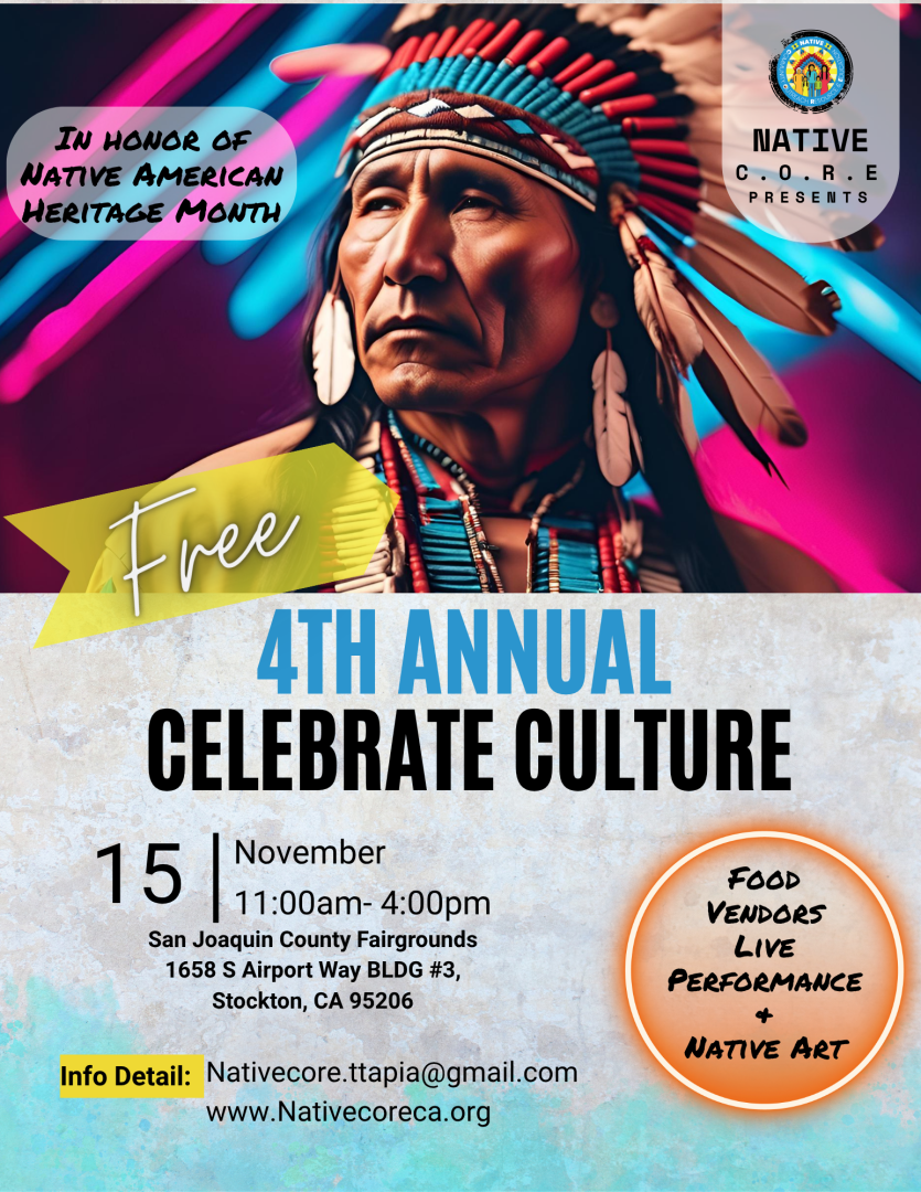 In honor of Native American Heritage month join the 4th Annual Celebrate Culture Event on November 15th from 11am - 4pm for art, food vendors, live music and more at the San Joaquin County Fairgrounds.