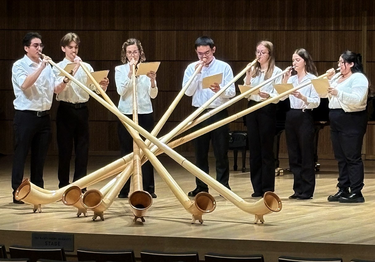 Dating back centuries in the Swiss Alps, the alphorn produces sound using only the natural overtone series—without valves or slides—offering a direct connection to the earliest traditions of brass performance. Under the direction of Professor Sadie Glass, one of four national ambassadors for the Alphorn Project, Pacific students are helping bring new life to this remarkable instrument.
