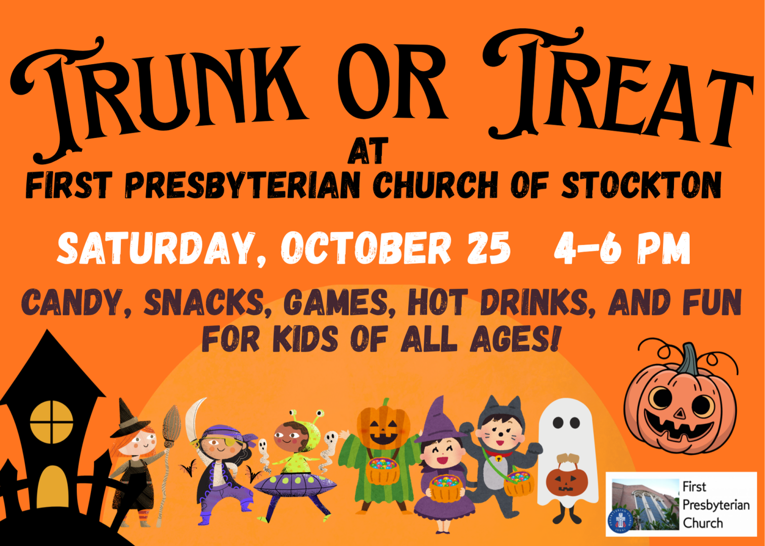 First Presbyterian Church will be hosting their annual Trunk or Treat on Saturday, October 25th from 4-6 pm. All kids and families are welcome to attend this fun event which will feature safe and fun trick-or-treating along with games, hot drinks, snacks, and fun activities. Costumes encouraged but certainly not required!