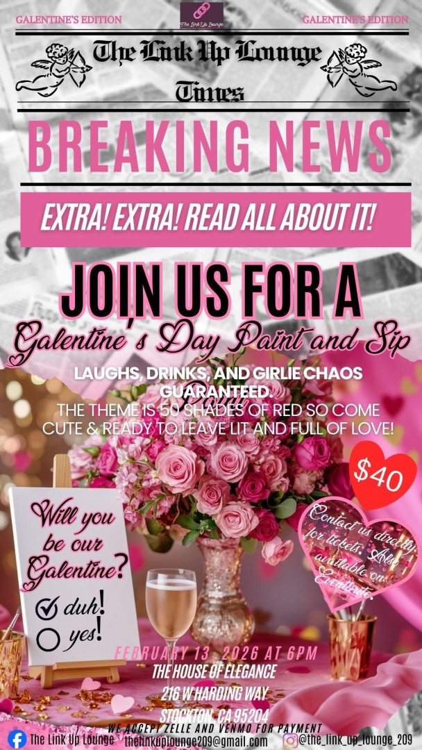 Grab your besties for a super fun in-person Paint and Sip party! Laughs, drinks and girlie chaos guaranteed! Get creative, sip on a cute drink, and celebrate Galentine's Day with the girls and good vibes. The theme is 50 shades of red. This will be an intimate setting so tickets are limited.