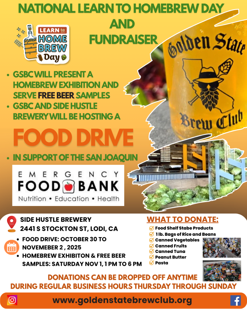 As part of our annual National Learn to Homebrew Day and Fundraiser, Golden State Brew Club and Side Hustle Brewery will be hosting a Food Drive in support of the San Joaquin Emergency Food Bank. Members and friends of the GSBC are encouraged to make donations of food shelf stable products such as 1 lb. bags of rice and beans; canned vegetables, fruits, and tuna; peanut butter, and pasta. Donations can be dropped off at Side Hustle Brewery during their regular business hours.