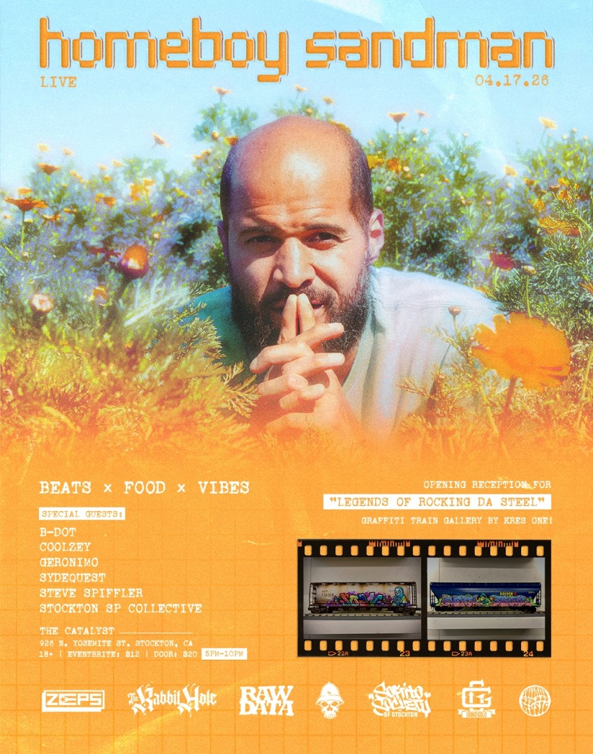 Homeboy Sandman from Queens NY will be headlining on his West Coast tour with Coolzey. Local acts include Steve Spiffler, B-Dot, The Stockton SP Collective and more.
