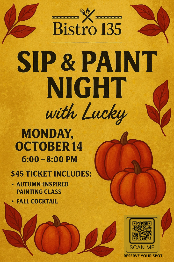 Step into Bistro 135 on Monday, October 14 from 6–8 PM for an intimate autumn evening of art, flavor, and community. This special Sip & Paint Night invites you to relax with friends, sip a handcrafted cocktail, and create your own seasonal acrylic painting guided by a local artist.