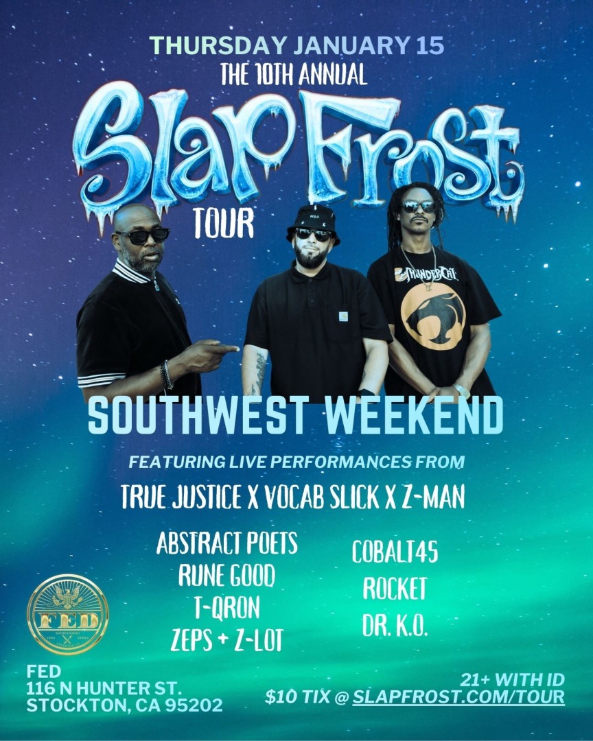 Underground Hip-Hop at it's finest. The 10th annual Slap Frost tour brings Bay Area legends Vocab Slick, Z-Man and DJ True Justice back to the 209.