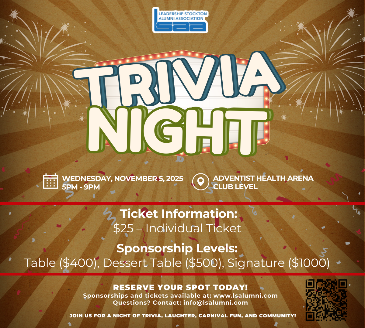 An evening of laughter, trivia, and comradery. Gather your friends, make a team, or come solo to enjoy carnival fun, delicious desserts, and prizes, all while supporting the Leadership Stockton Alumni Association’s mission of leadership, and community growth.