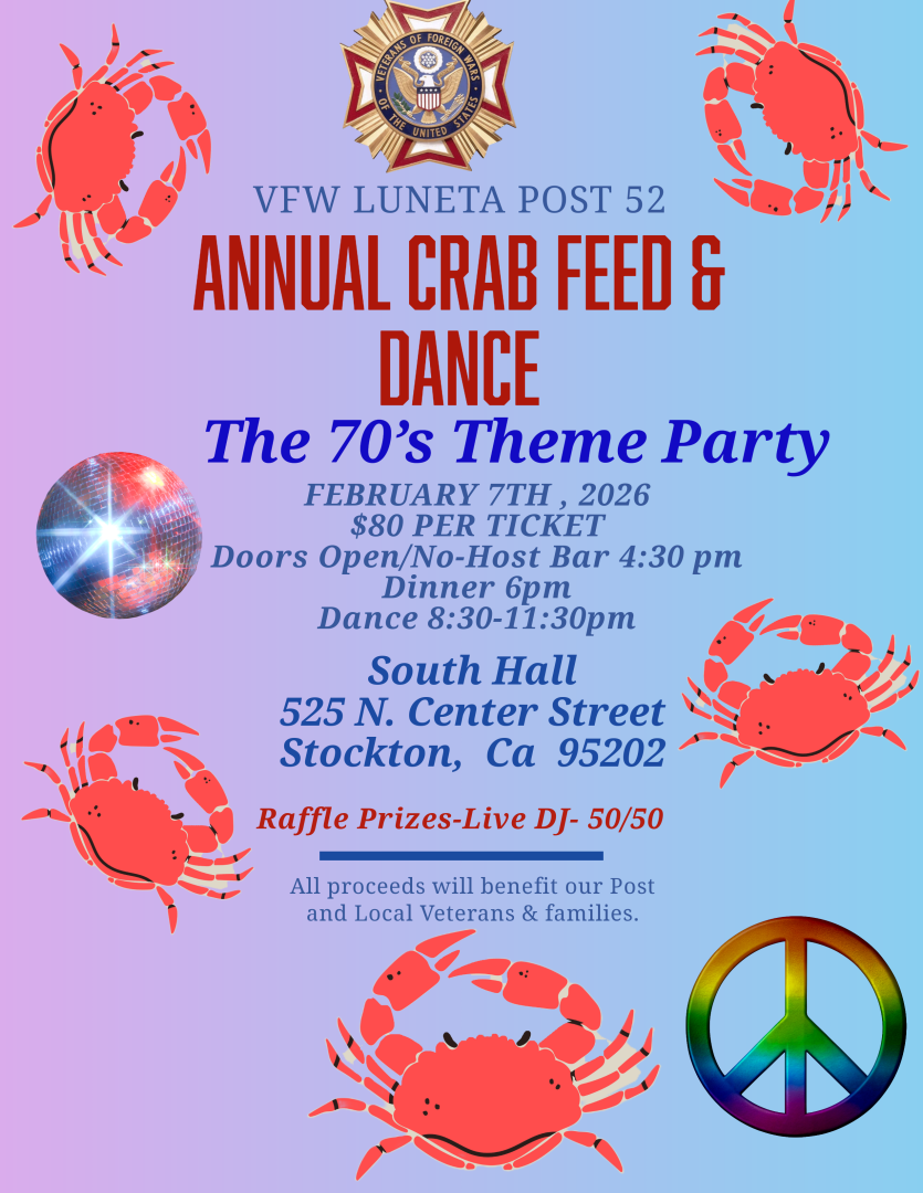 Stockton, get ready for one of the city’s most anticipated community traditions. VFW Post 52 proudly hosts its Annual Crab Feed & Dance, bringing friends, families, and neighbors together for a night of great food, lively music, and hometown spirit.