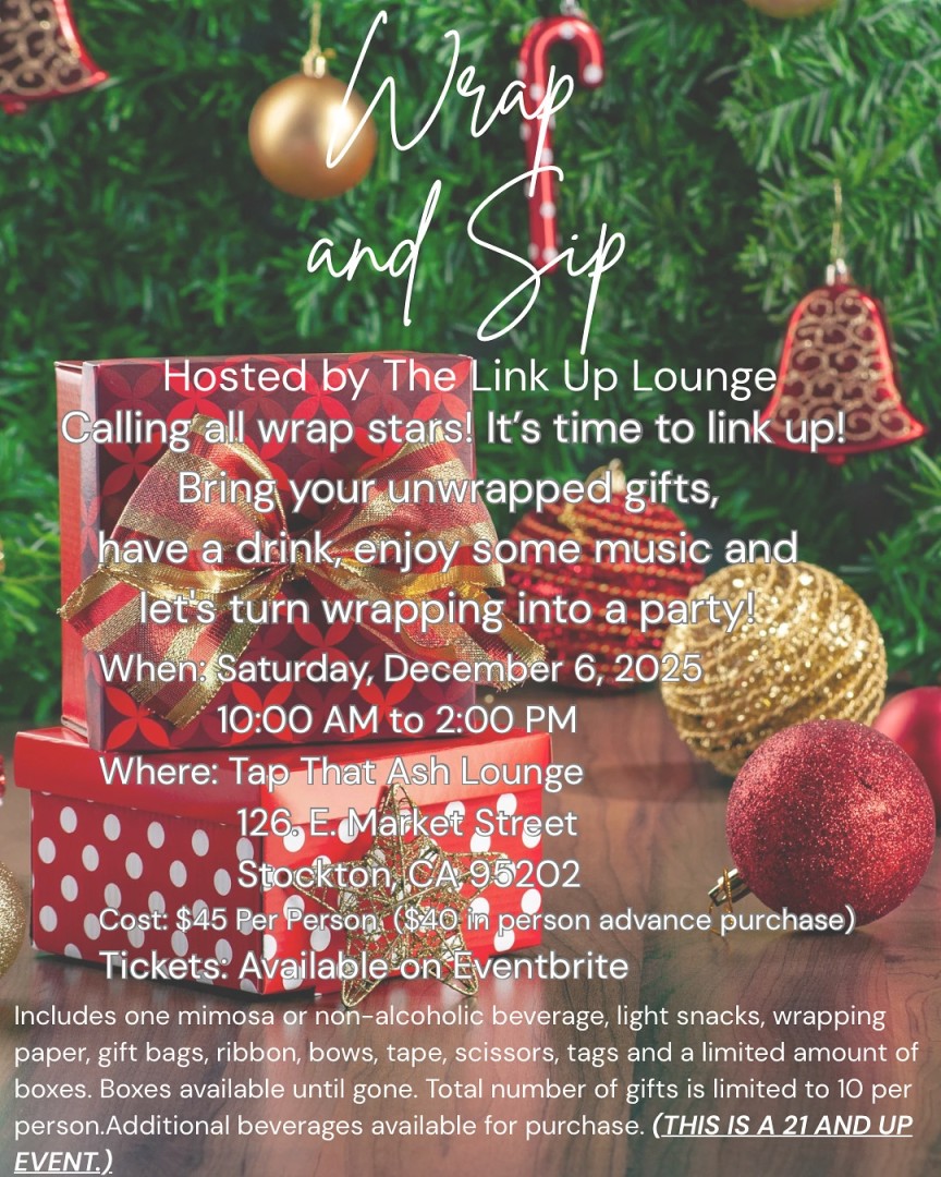 Bring your unwrapped gifts, have a drink, enjoy some music and let's turn wrapping into a party! Ticket includes one mimosa or non-alcoholic beverage, light snacks, wrapping paper, gift bags, ribbon, bows, tape, scissors, tags and a limited number of boxes. Boxes available until gone. Total number of gifts is limited to 10 per person. Additional beverages available for purchase.